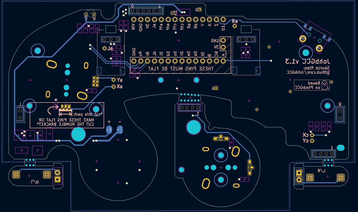 I wanted to make the holes for some parts like the L/R potentiometer and GCC cable not through hole plated to make it easier to desolder (as it is on a OEM GCC board) but I haven't looked into how to do this enough and misunderstood a option in KiCad ("connected layers only") so I didn't got exactly what I wanted: