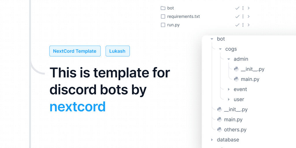 Nextcord Bot Template This is template for discord bots by nextcord. How to use: Install all the requirements pip install -r requirements.txt Setup environment variables Get a bot token Assign environment variables as "TOKEN" Setup cogs Admin User Event Other Database setup engine register models Run run.py Help Ukraine! To donate money for the Ukrainian army: Link: https://war.ukraine.ua/donate/ 💙💛 Glory To Ukraine 💙💛
