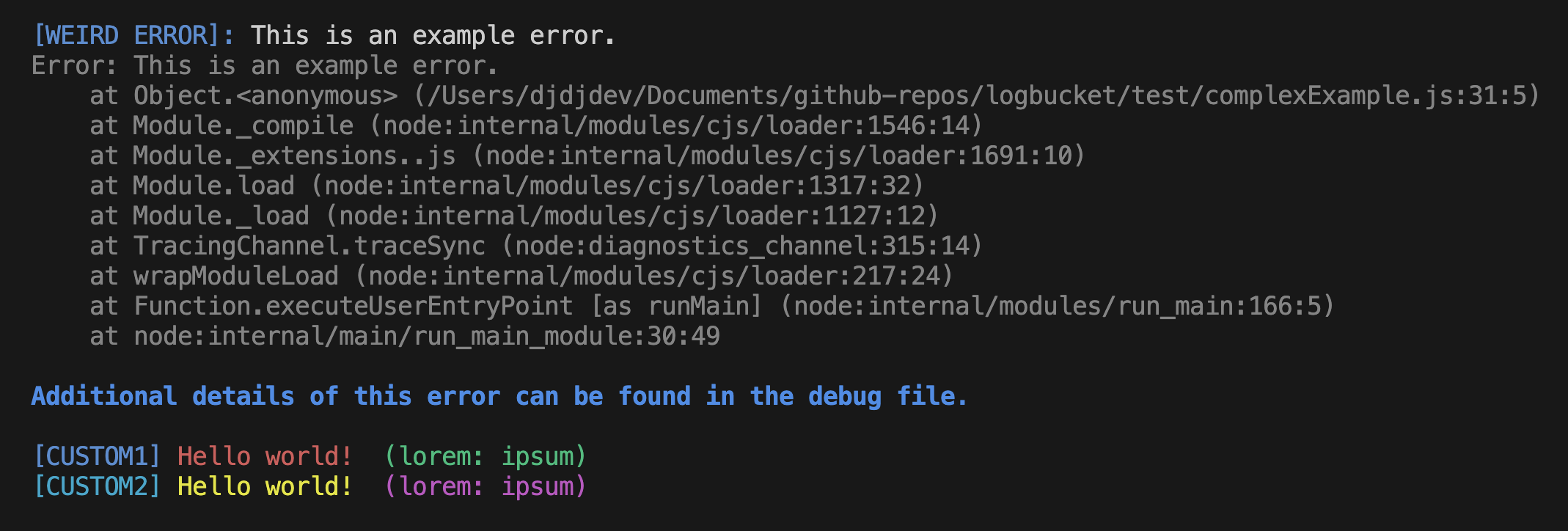Logbucket is a lightweight and customizable logging library for Node.js featuring beautiful logs with configurable colors, prefixes and the ability to be saved to a debug file in real-time. If you're having trouble configuring the library, feel free to join our support server and we will help you further!