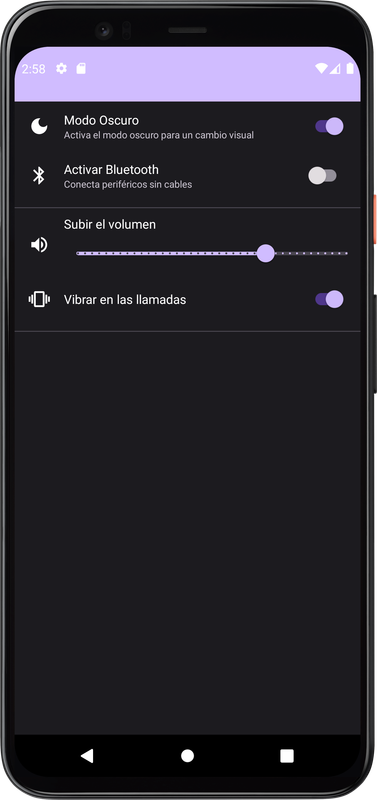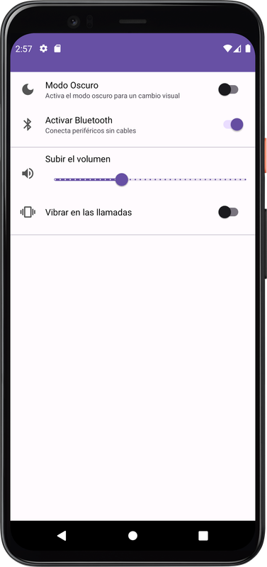 Pantalla de ajustes para activar el Modo Oscuro, Bluetooth, Volumen y Vibración para llamadas. En este proyecto hacemos uso de la Persistencia de Datos con DataStore.