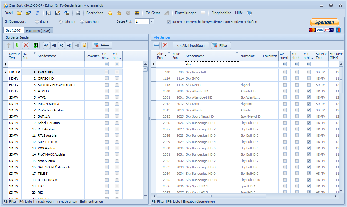 - Umreihen von Sendern (direkte Nummerneingabe, auf/ab verschieben, drag&drop, Doppelklick)