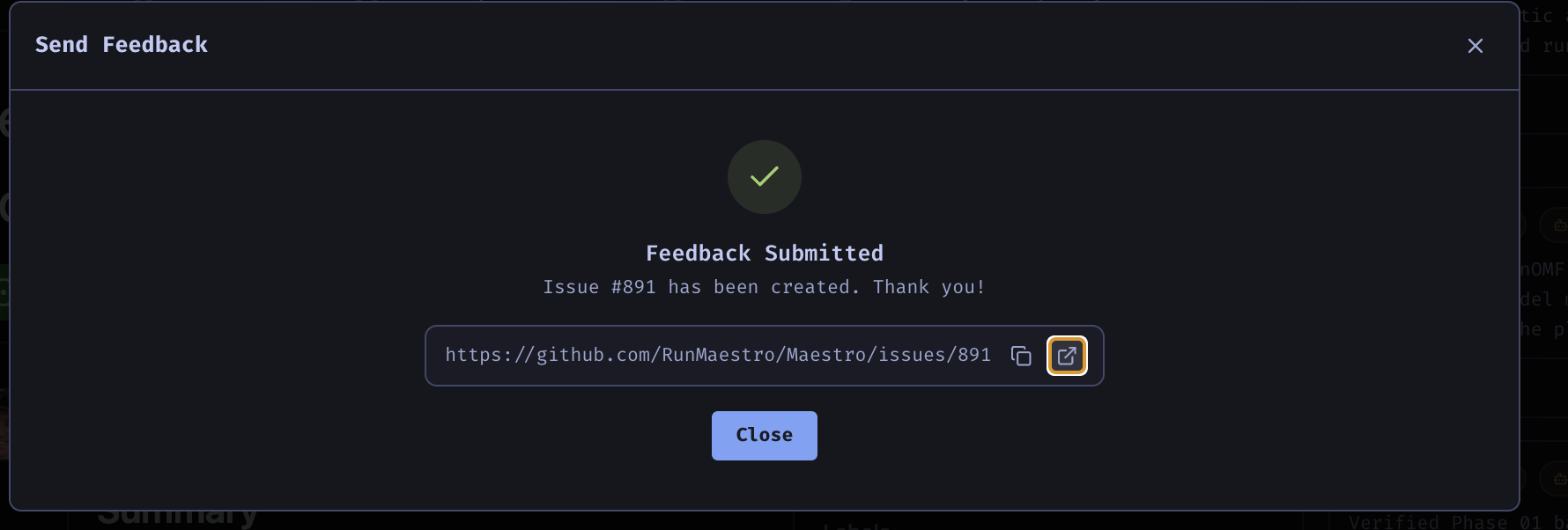 After creating a feedback issue, clicking the rightmost outbound-link icon in the success modal should close the modal and open the newly created issue URL in a Maestro browser tab when the global URL-opening setting is set to browser tabs. If the global setting is external browser, it should open in Chrome instead.