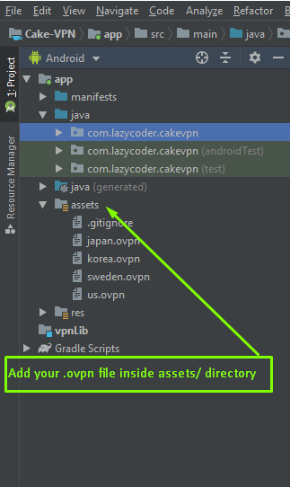 - Replace/add your .ovpn file with assets/ directory .ovpn file