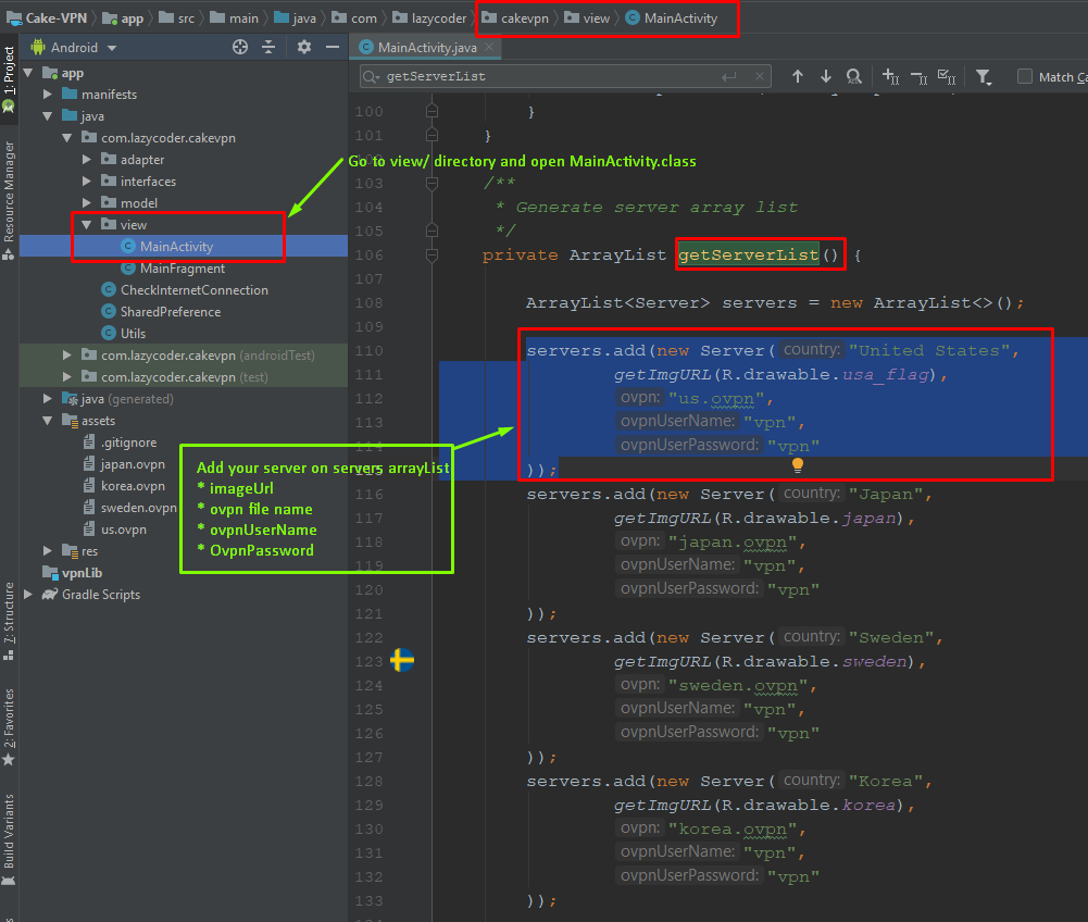 - Now go to MainActivity.class and find the "getServerList()" method there you have to update server information.