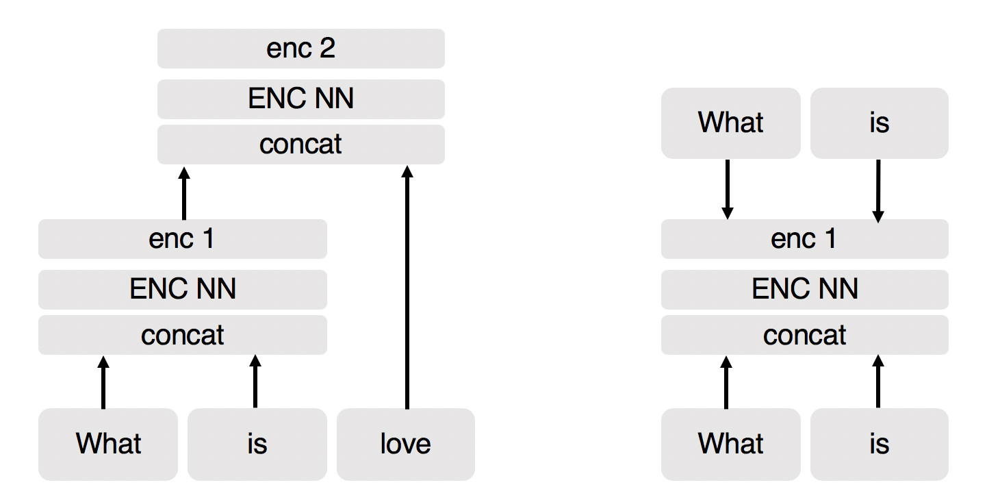 The figure above shows the implemented model, which is similar to Socher et al. Word2Vec embedding is generated with a vocabulary size of 100000 according to Tensorflow Word2Vec opensource release, using the skip gram model. In these embeddings, words which share similar context have smaller cosine distance. The key problem is dealing with questions of different lengths. The information content of a sentence is compressed by training an auto encoder. The main motivation behind this approach is to find similarity between sentences by comparing the entire sentence as well as the phrases in the sentence. The problem of different lengths is circumvented by upsampling and dynamic pooling as described below.