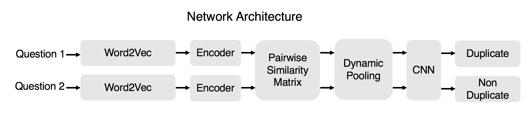 The entire sentence with its intermediate encodings can be used as input to the upsampling and dynamic pooling phase. In the upsampling phase, the smaller vector of the question pair considered is upsampled by repeating the encodings randomly chosen of the vector to match the length of the other question encodings. A pairwise similarity matrix is generated for each phrase vector, and the variable dimention matrix is pooled into a matrix of npool x npool. I used npool = 28. This matrix is fed into a CNN classifier to classify as duplicate or not. A hyper parameter optimization of npool could also increase tha accuracy. The accuracy of this model is 63.8 % .