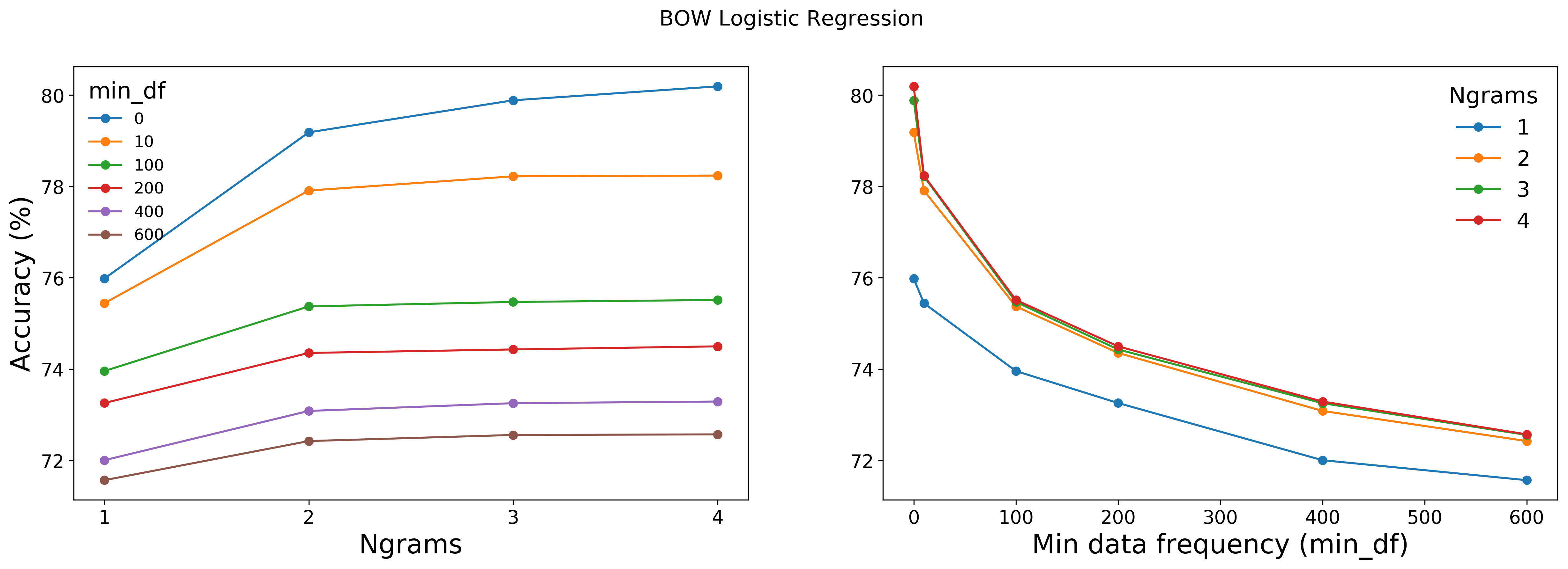 For the BOW model parameter sweep vocabulary size ranges from 703912 (n-grams = 4 and min_df =0) to 1018 (ngrams = 1 and min_df = 600).