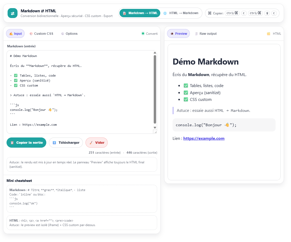 Convertisseur bidirectionnel Markdown ↔ HTML avec aperçu en temps réel, 100% statique et sans dépendances