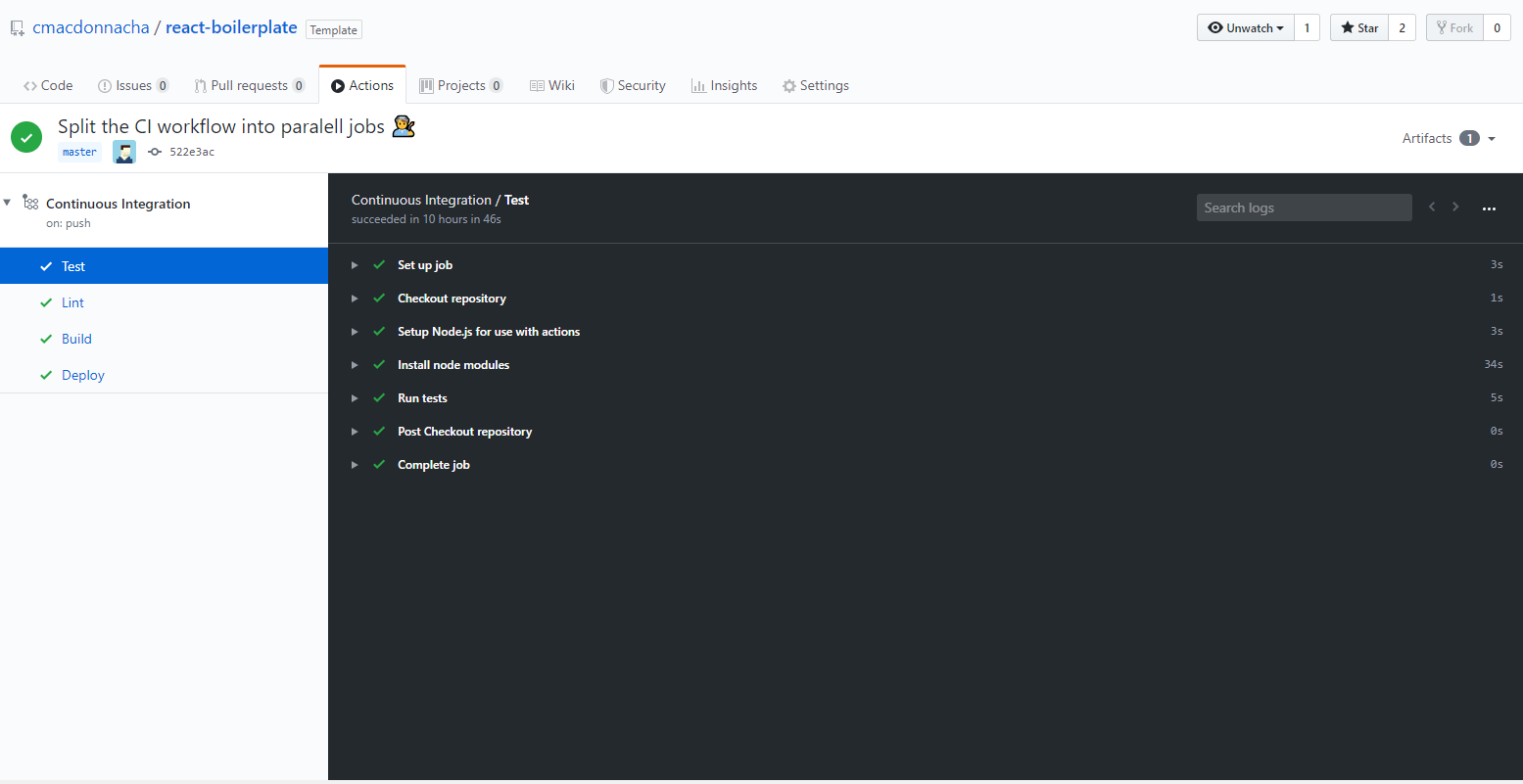 This boilerplate uses Github actions to continuously test, build and deploy. You can see the workflow file in the workflows folder.