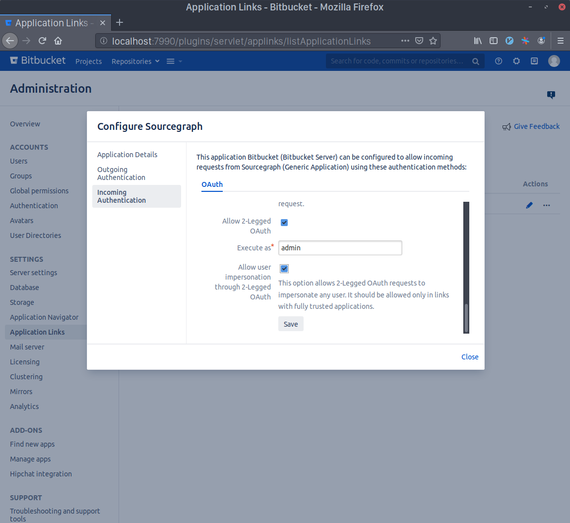 This section walks you through the process of setting up an Application Link between Sourcegraph and Bitbucket Server and configuring the Sourcegraph Bitbucket Server configuration with authorization settings. It assumes the above prerequisites are met.