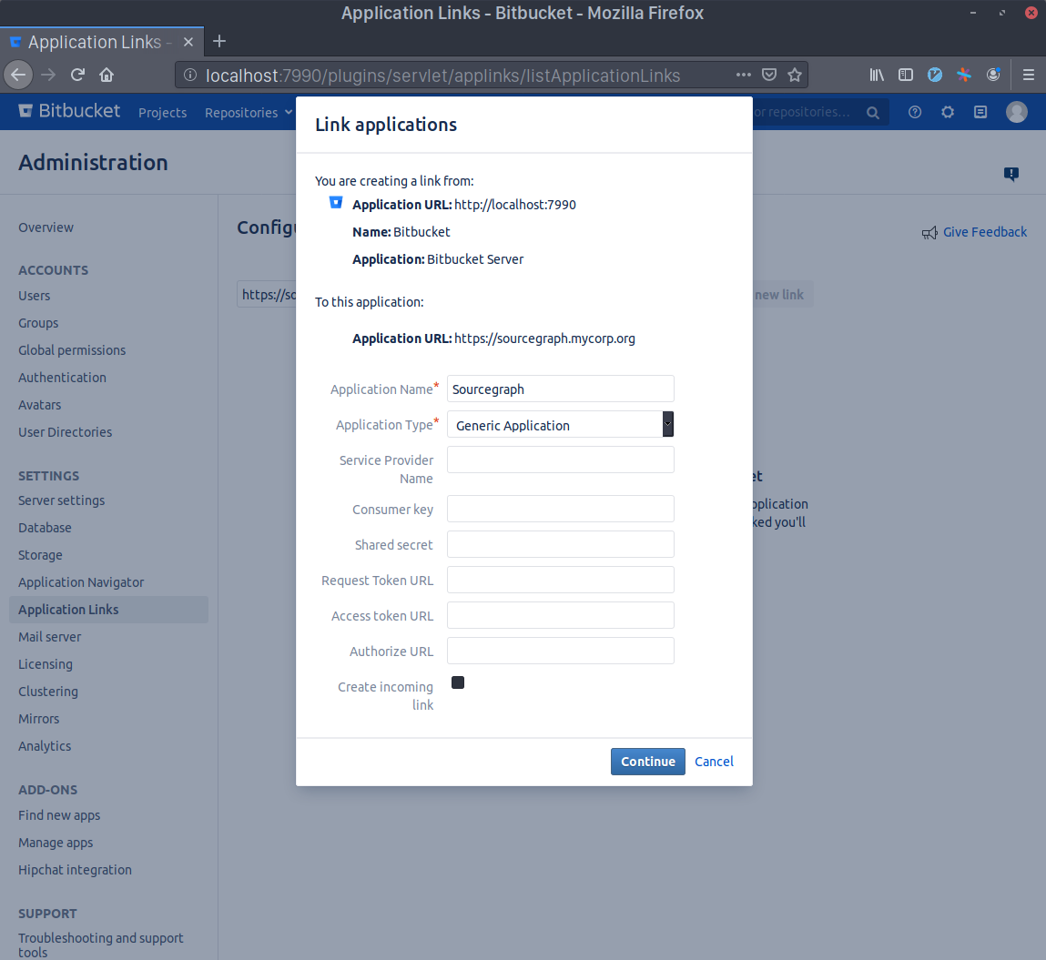 Write Sourcegraph's external URL in the text area (e.g. https://sourcegraph.example.com) and click Create new link. Click Continue even if Bitbucket Server warns you about the given URL not responding.