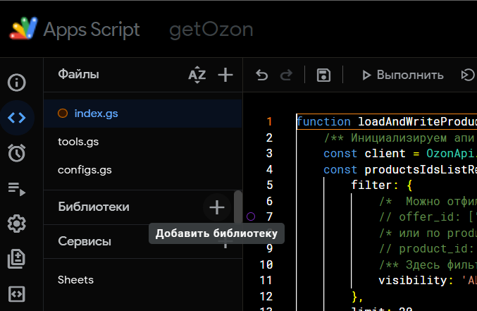 - После подключения к скрипту, в разделе “Библиотеки” появится новый, нужный нам элемент. Значение “OzonApi” говорит о том, что именно через этот объект возможно получить доступ.