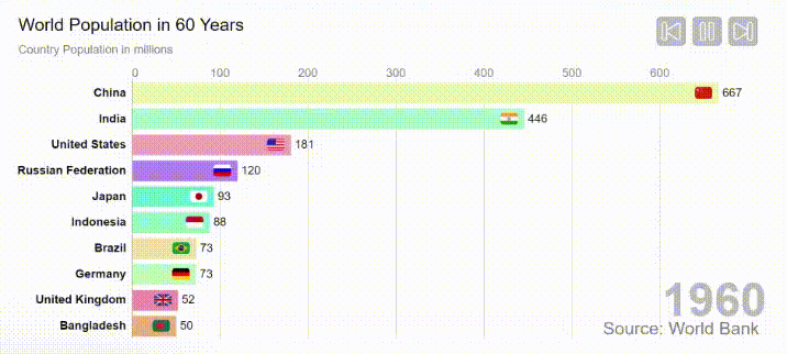 RacingBars is available for JavaScript, TypeScript, React, Vue and Svelte.