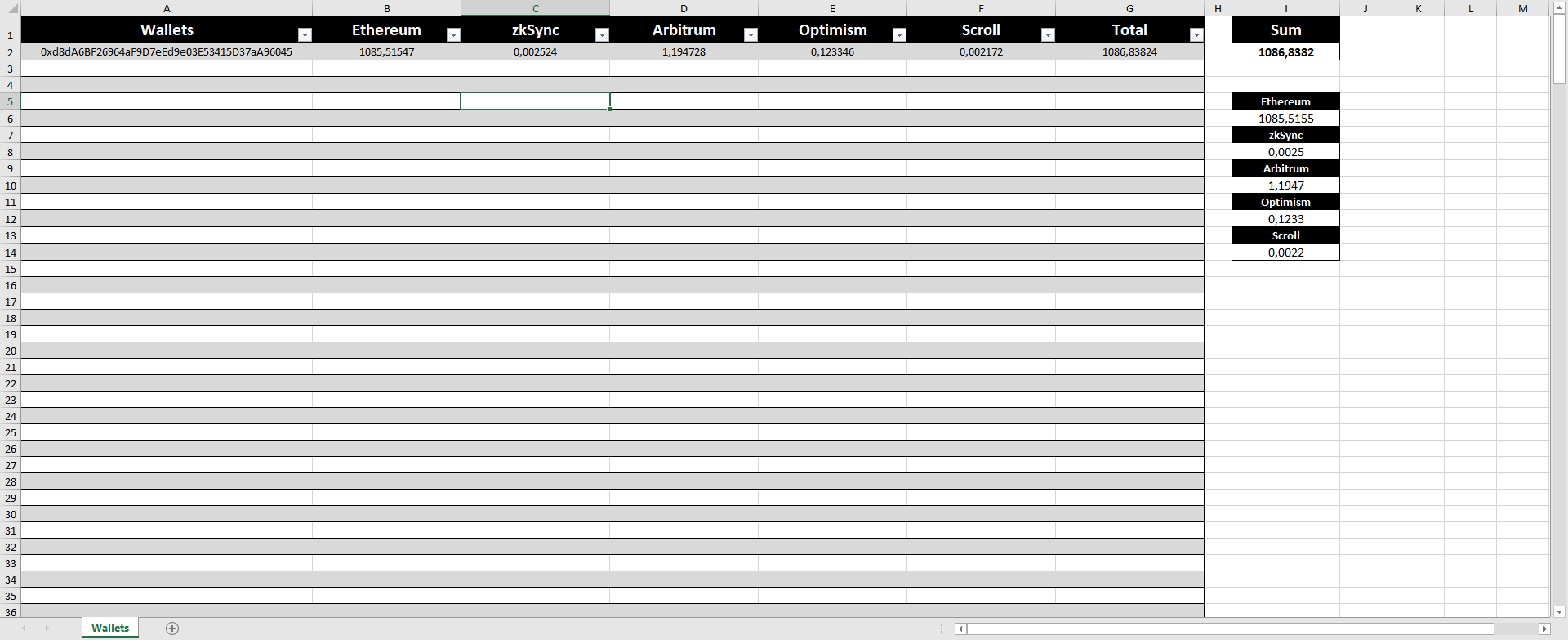 EVM Balance Checker - A software with which you can instantly check your ETH balance in blockchains such as: Ethereum, zkSync, Arbitrum, Optimism and Scroll.