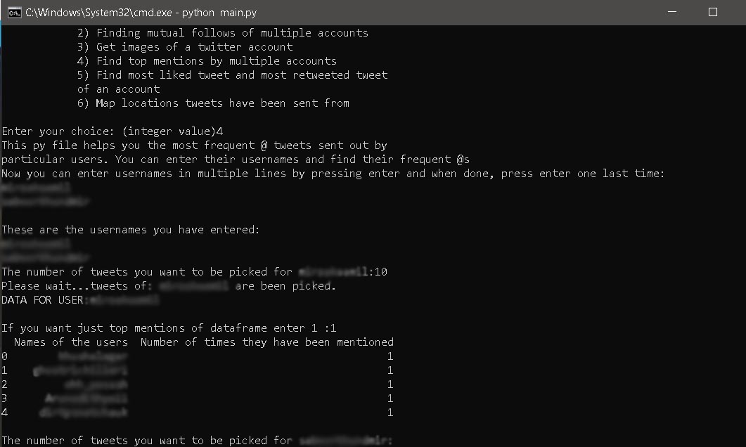 I learned programming in python and this is my first significant project. This project is meant to help user scrape twitter data of twitter users under any username. You can give multiple usernames for most of the different tools that are available under this project. I am looking forward to introduce more functionality and write cleaner code as I move ahead in my journey with python.