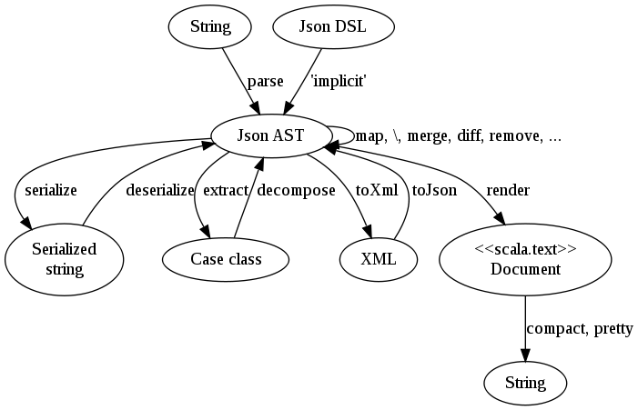 type JField = (String, JValue)All features are implemented in terms of above AST. Functions are used to transform the AST itself, or to transform the AST between different formats. Common transformations are summarized in a following picture.