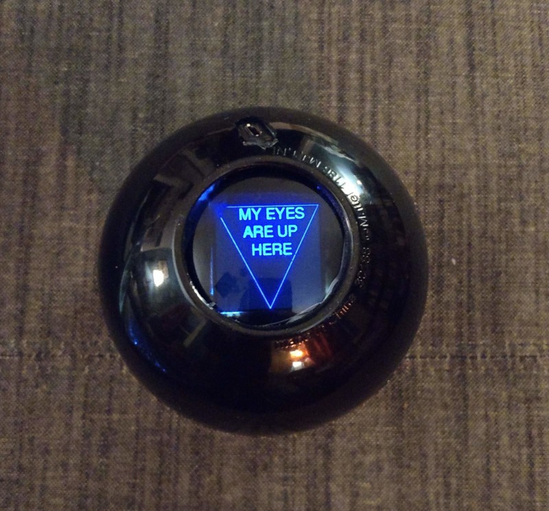 This is hostile art: art that invites the viewer to interacat with it, only to punish them for doing so. In this case, it's a Magic 8 Ball that says rude things when it's picked up.