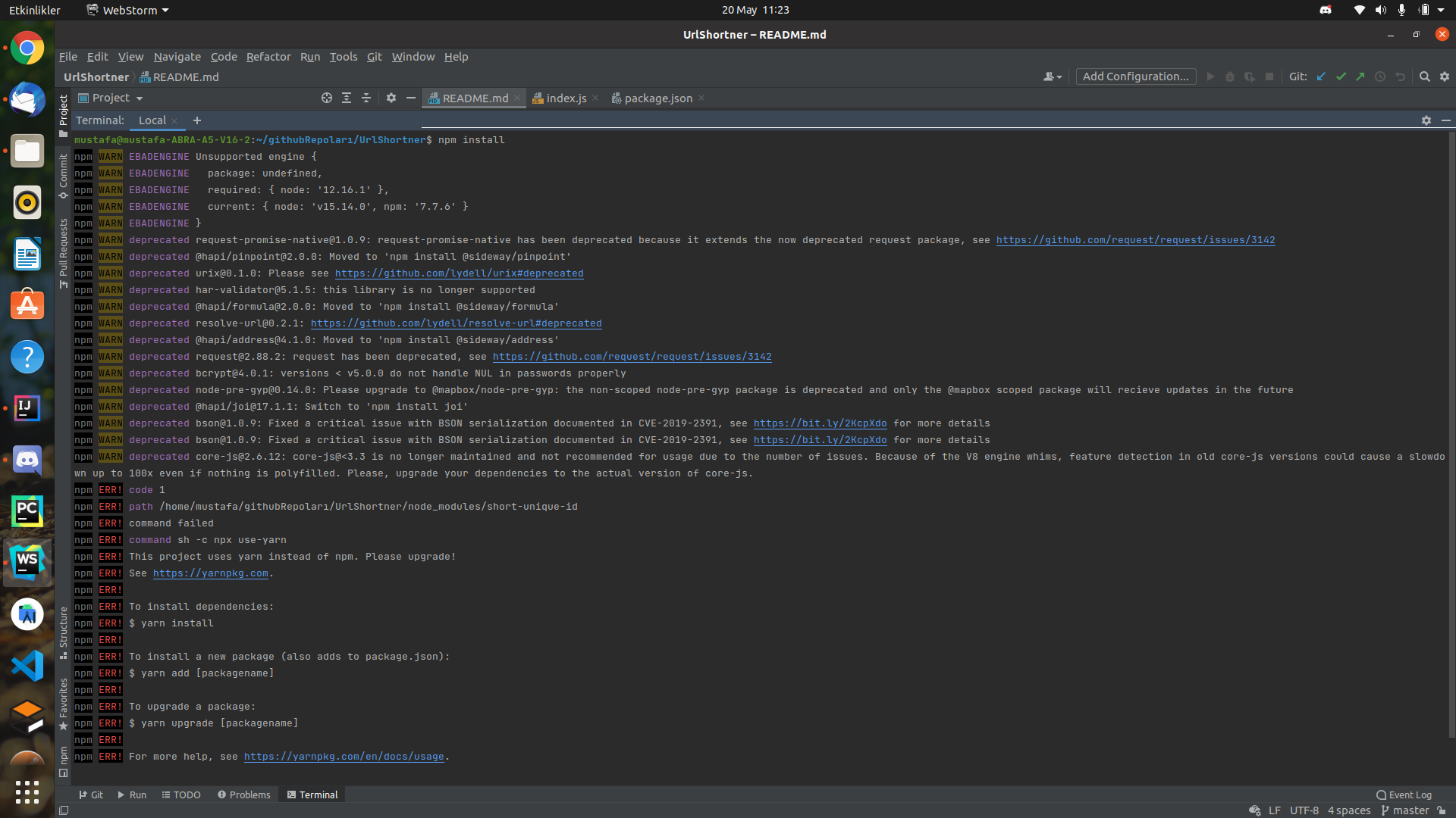 when I write npm install I get this error that I left belove it say you should install yarn but I have yarn but it stil don't work. what should I do?