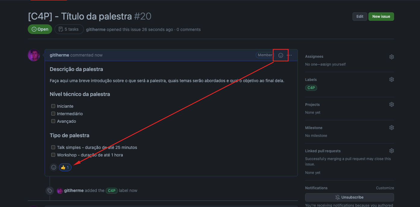 Para isso, após submeter sua palestra, clique no ícone de emoji, no canto superior direito da sua issue, e adicione o emoji 👍 como reação para vermos a adoção dos membros da comunidade em relação aquela palestra, assim conseguimos colocar as palestras que os membros mais precisam nos eventos mais próximos.