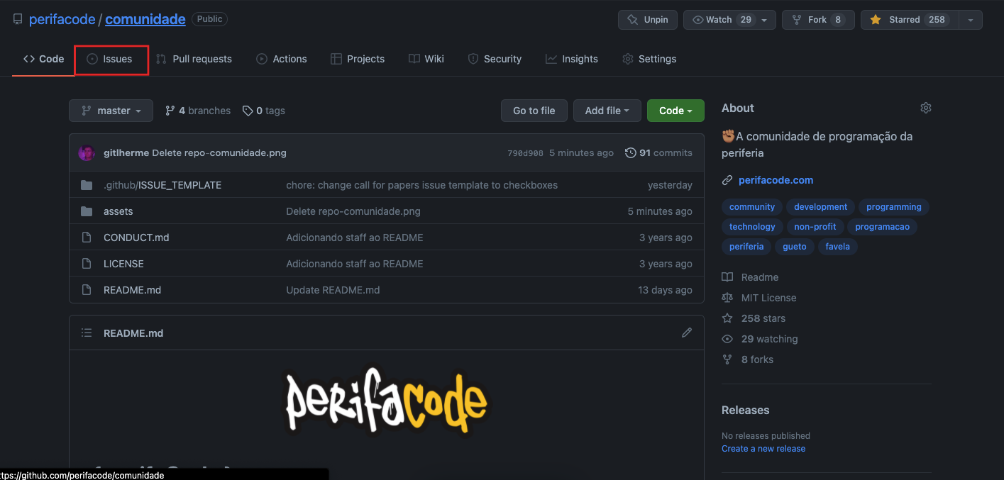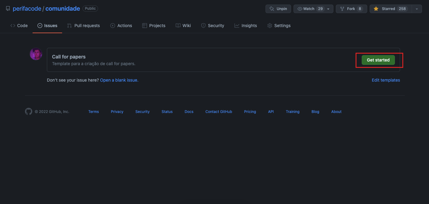 Dentro do nosso repositório da comunidade, vá até Issues e depois clique em New issue ou clique aqui para cair direto na página de escolha do template.