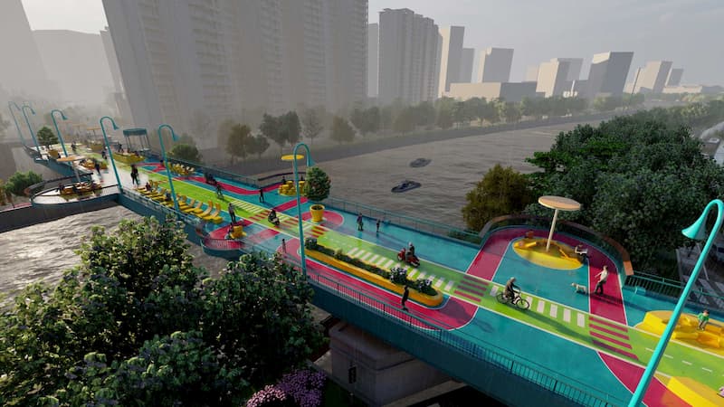 最近,上海的一家建筑事务所提出一个改建方案,将这座桥改建成多功能高架公园,灰色的沥青被大胆活泼的颜色替代,通过颜色勾勒出不同的动线。
