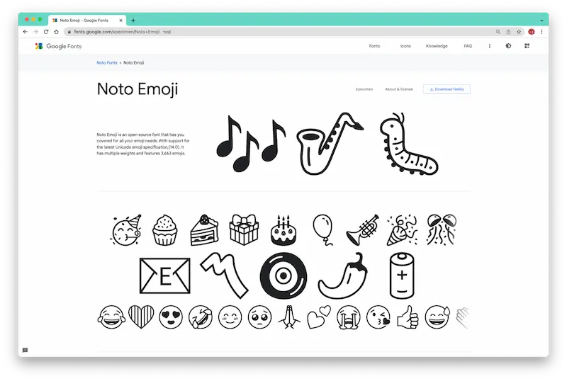 谷歌推出的一款单色的 Emoji 表情字体,共有3000多个符号,优点是体积小。如果希望表情符号在各平台都是同一个样子,可以用它。