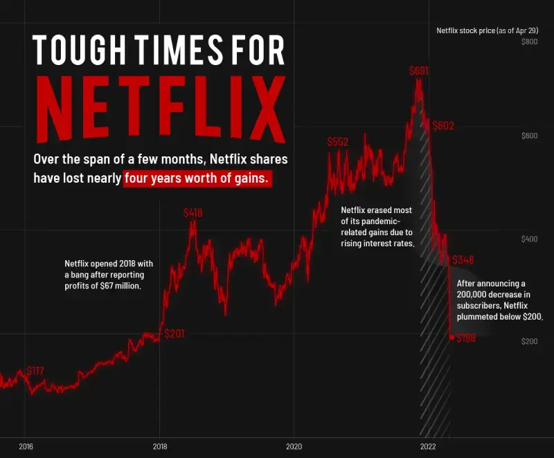 首先要看到,这不是中国独有的现象,国外互联网公司日子也不好过。流媒体平台 Netflix 和脸书的股价,最近都是暴跌。