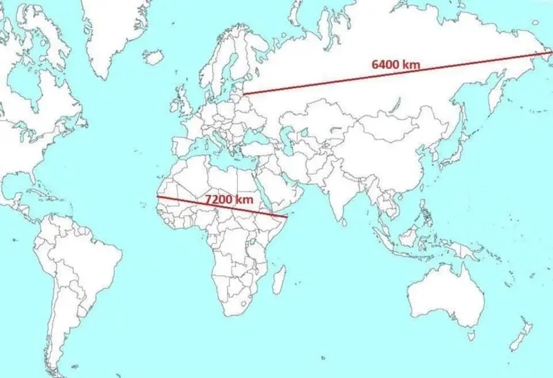 有时候,看地图会误判,地图上俄罗斯过大(6400公里),非洲过小(7200公里)。