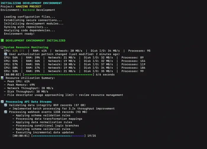 一个命令行工具,唯一作用就是让你的终端显得很忙,源源不断有输出,适合摸鱼。
