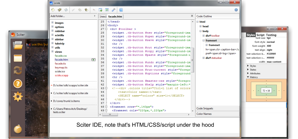 Sciter is an Embeddable HTML/CSS/script engine for modern UI development, Web designers, and developers, can reuse their experience and expertise in creating modern looking desktop applications.