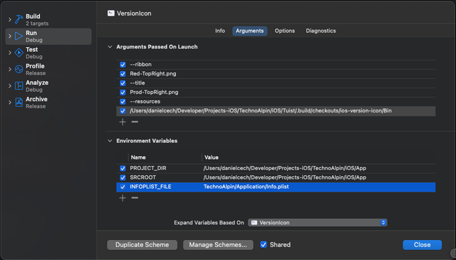 If you want to modify the behavior and debug VersionIcon in context of your project, you need a special setup of the scheme. The screenshot shows the commandline arguments passed on launch. These parameters can be copied from the existing VersionIcon call build phase. And three environment variables that are necessary to propagate. The values of these environment are visible in the Xcode's Report navigator. All checkboxes should be on.