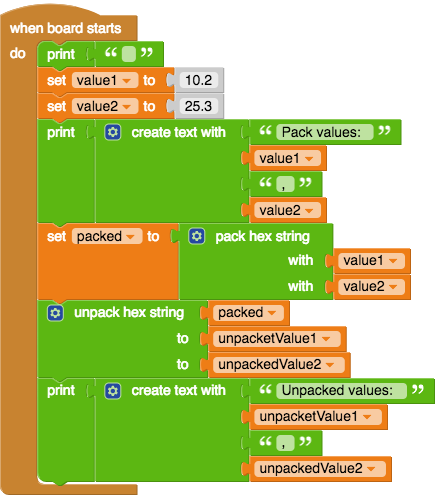 In this example the values 10.2 and 25.3 are packed and then unpacked.